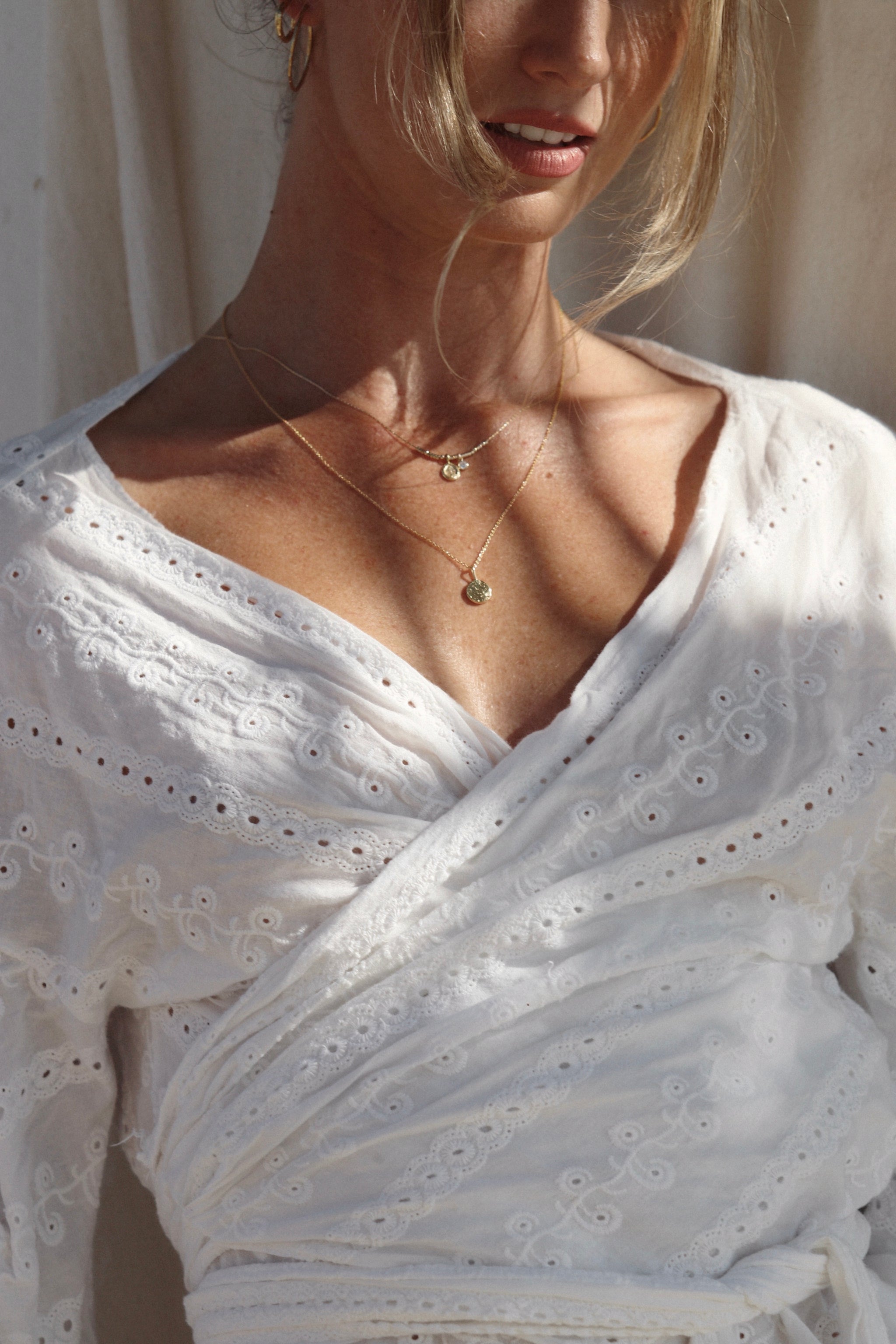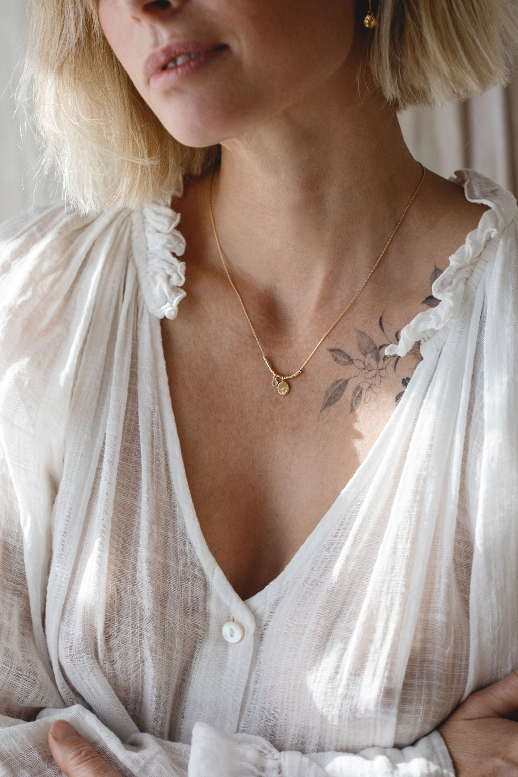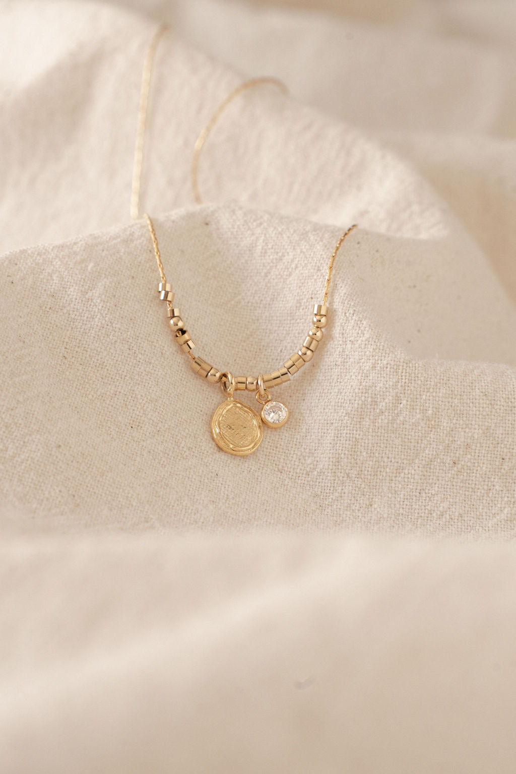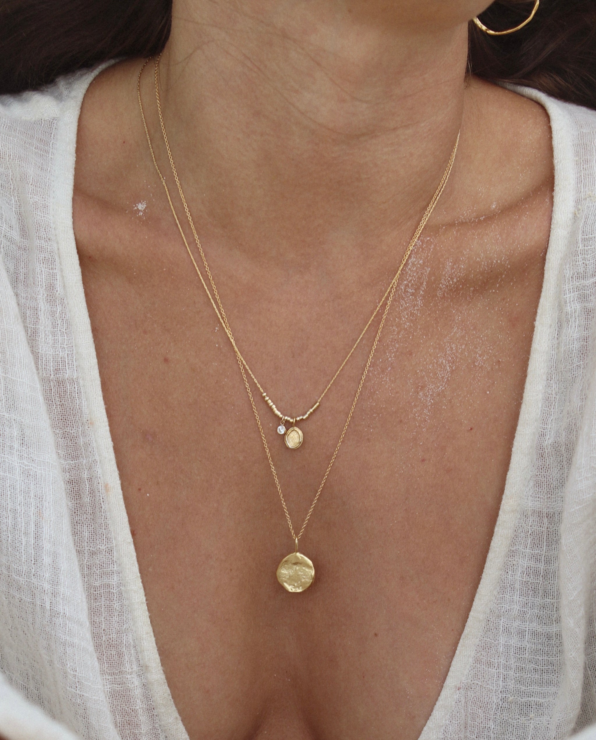 Alma features a pendant crafted from the ancient lost wax technique delicately pressed from linen, which symbolises the tender care and warmth of motherhood.