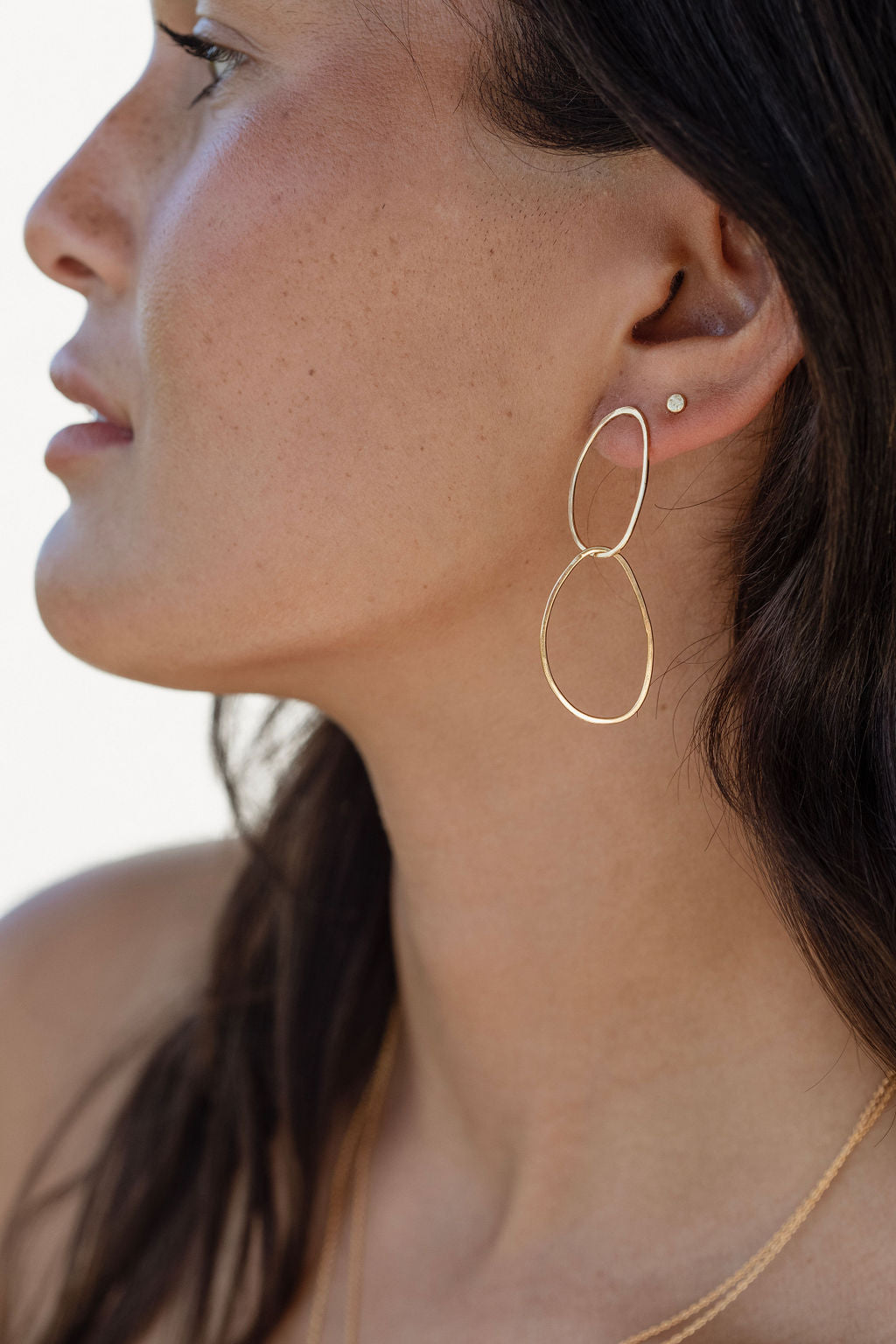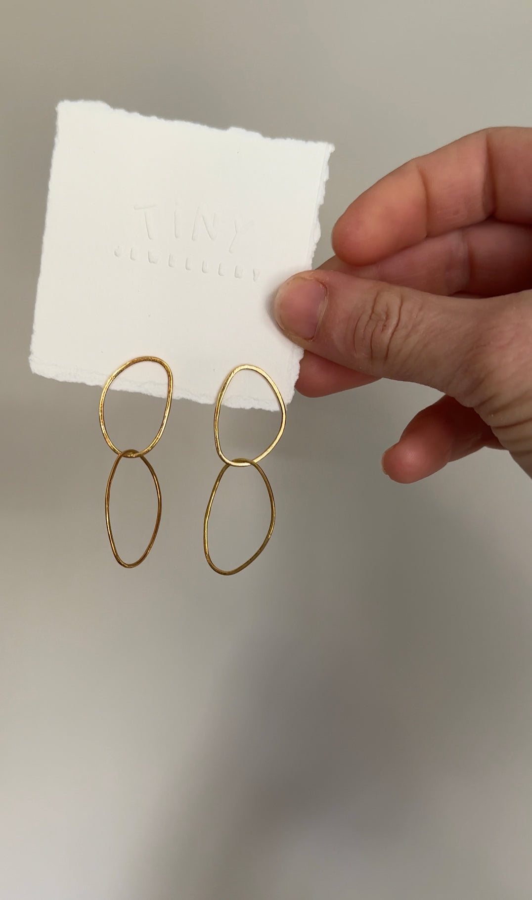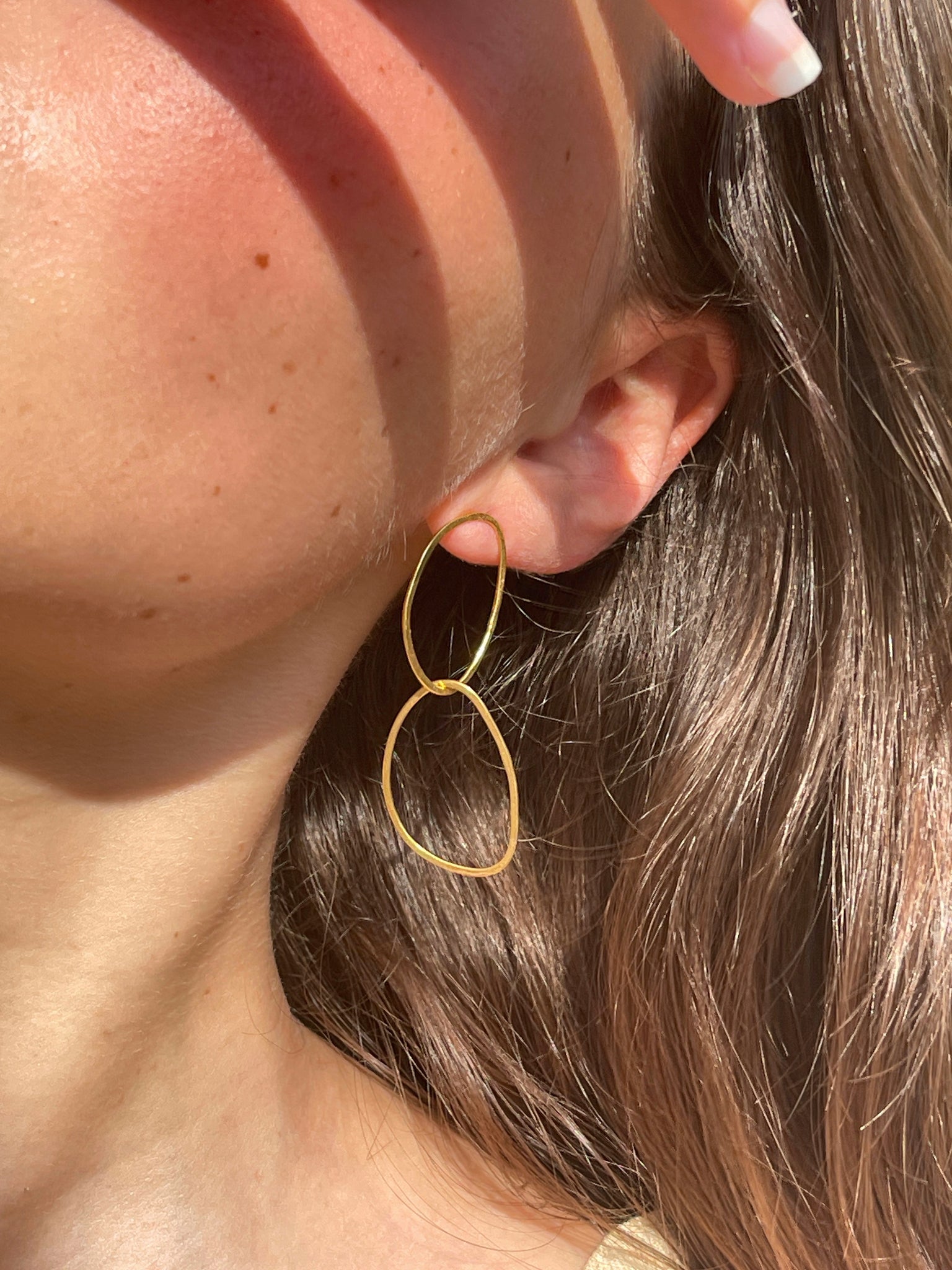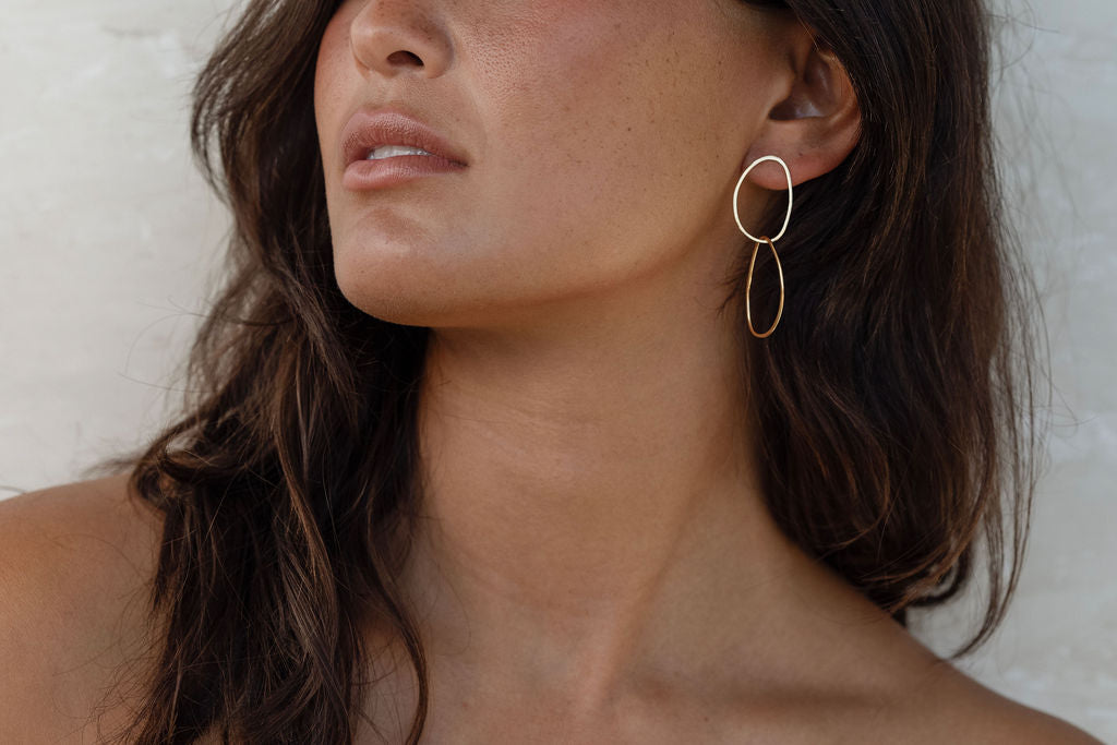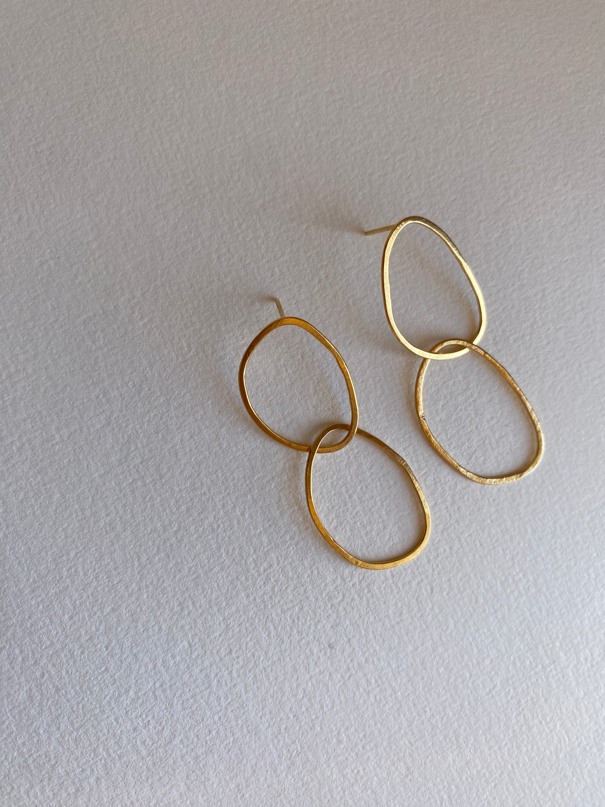 The Never Appart earrings are handcrafted by intertwining two imperfect shaped ovals with the second one being free moving which makes them look slightly different every time one looks.